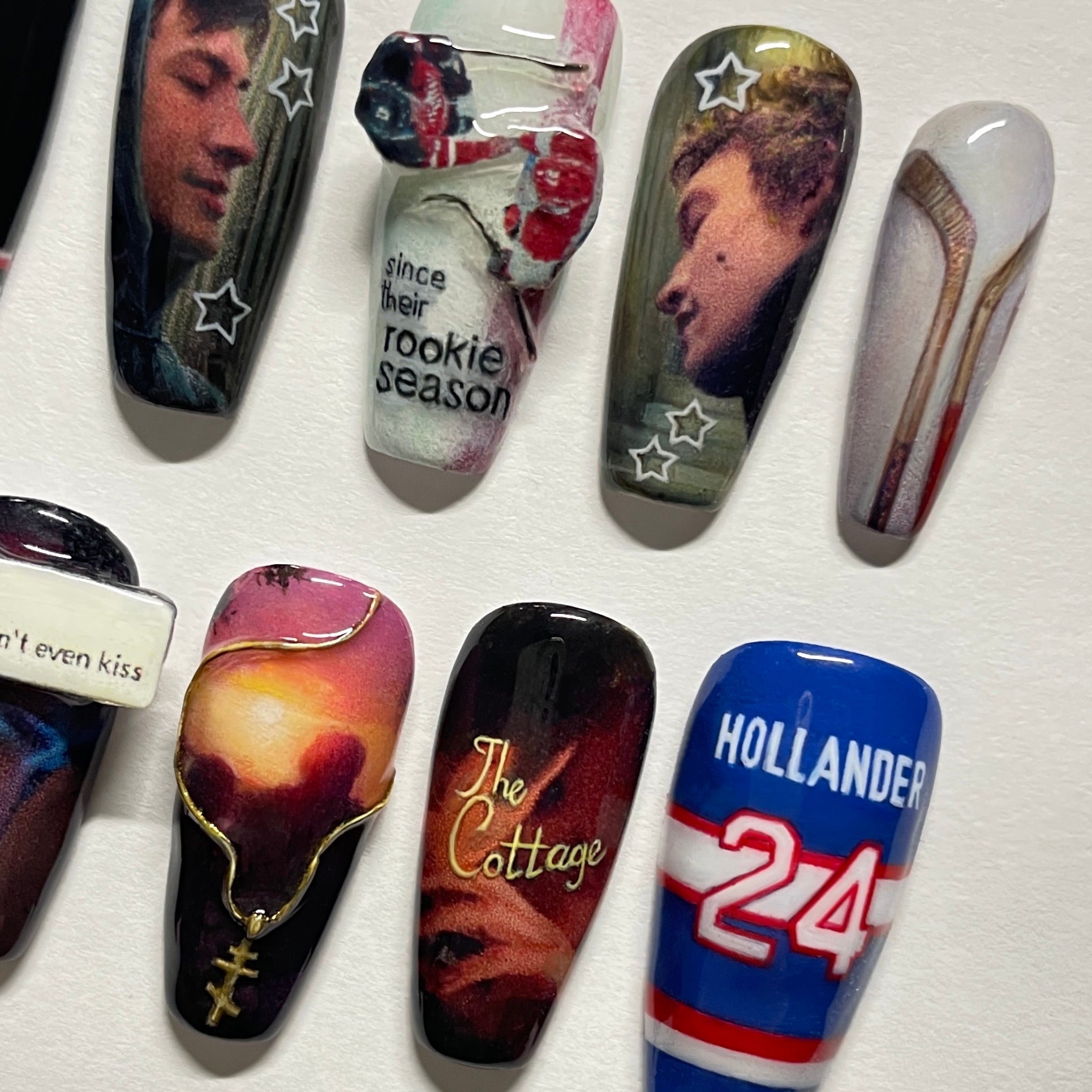 Each package includes 10 hand-painted nails and an application kit. The application kit includes a mini buffer, nail file, nail glue, 12 sticky tabs, 1 alcohol wipe, a wooden cuticle pusher, and instructions explaining how to apply!